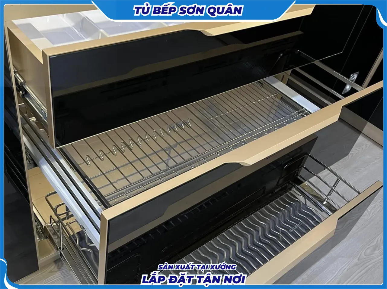 Phụ kiện: Ray trượt, bản lề giảm chấn, tay nắm inox hoặc hợp kim sang trọng.